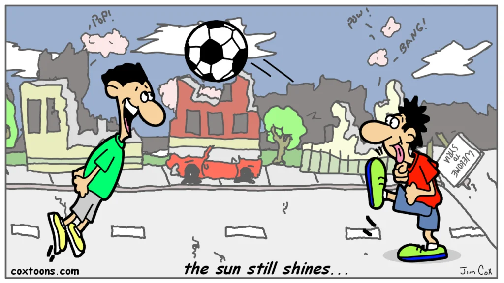 Two children playing soccer in the street of war-torn Syria-Middle East. Sounds of Explosions in the distance however, children still find a way to be just children.