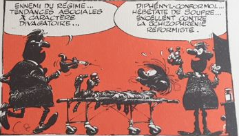 Franquin’s art style continued to evolve in the 1960s and 70s, becoming more dynamic and expressive. In 1977, during another bout of depression, he created Idées noires, a darkly humorous and pessimistic strip tackling themes such as war, death, and pollution. Initially published in Le Trombone Illustré, it later moved to Fluide Glacial.