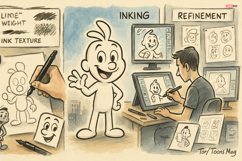 Strong, confident ink lines emphasize the structure of your characters. This process clarifies the composition by enhancing basic shapes and supporting details, ensuring that your cartoons are both dynamic and easy to read.