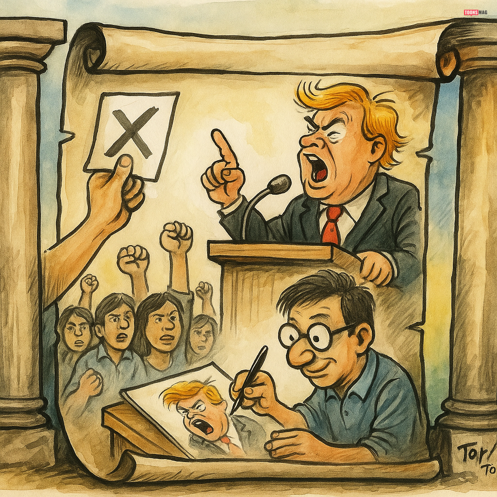 Cartooning Democracy: Editorial cartoons have long been recognized as one of the most potent forms of political commentary, offering a unique blend of humor, satire, and social critique. These cartoons distill complex political issues into digestible, impactful visuals, often targeting the heart of societal and political injustices. Their ability to shape public opinion, challenge authority, and engage citizens in discourse makes them an invaluable tool for democracy. Whether focusing on the actions of government leaders, highlighting social injustices, or reflecting public sentiments, editorial cartoons play a vital role in civic engagement by fostering critical thinking, encouraging political participation, and holding power to account.