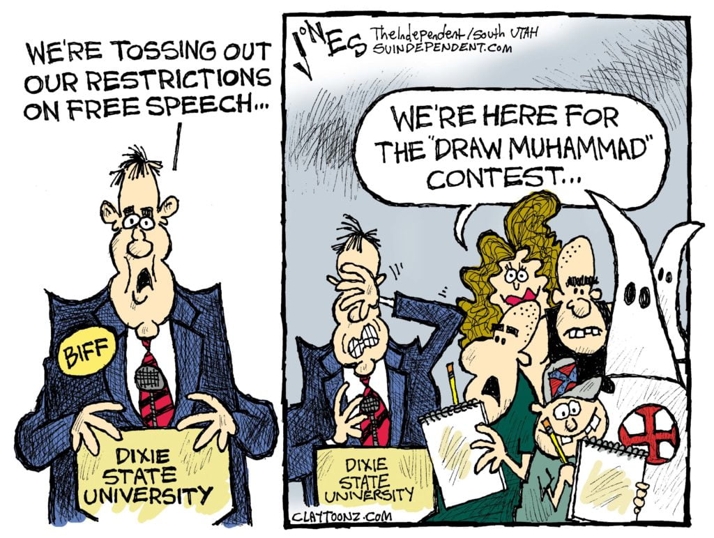 As former Nation publisher Victor Navasky notes in his 2013 book The Art of Controversy, editorial cartoons have the power to upset people that words rarely match. As a visual form, cartoons travel at the speed of light, whereas a speech travels at the speed of sound and written words are slowed down by the effort of the eye to riddle them out. As you plod word by word through this sentence, you can’t untangle the full meaning until you reach the end. By contrast, a cartoon hits you like a punch in the eye.