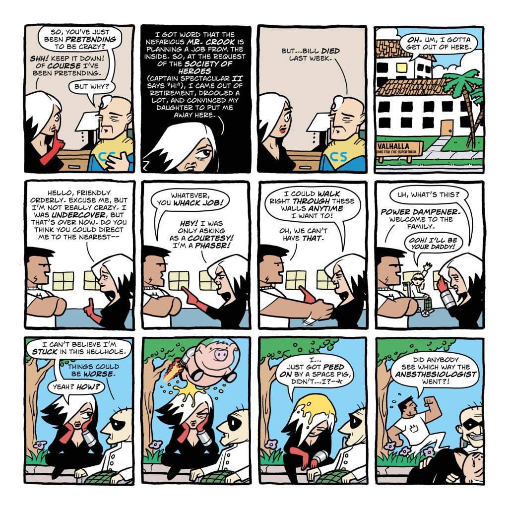 SuperFogeys was just supposed to be a gag-a-day strip. That was all creator Brock Heasley had in mind for it when he began. But, very quickly, a story formed and took over the narrative. The arrival of Spy Gal and her falling into Dr. Rocket’s lap (literally) kicks off the real meat of Chapter 1, and will culminate in the upcoming last panel of the chapter that points the way towards everything the rest of the saga will be.