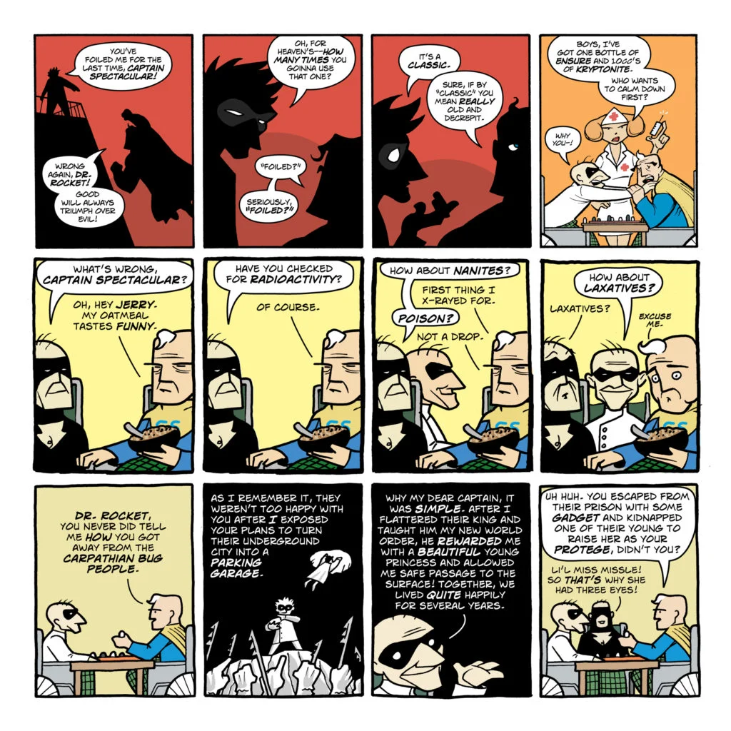 The SuperFogeys begin! You might notice a bit of a step down from the artwork on our cover. Like a lot of comics, it took a little while for SuperFogeys to find its footing, artistically speaking. This will improve quickly. Trust us.