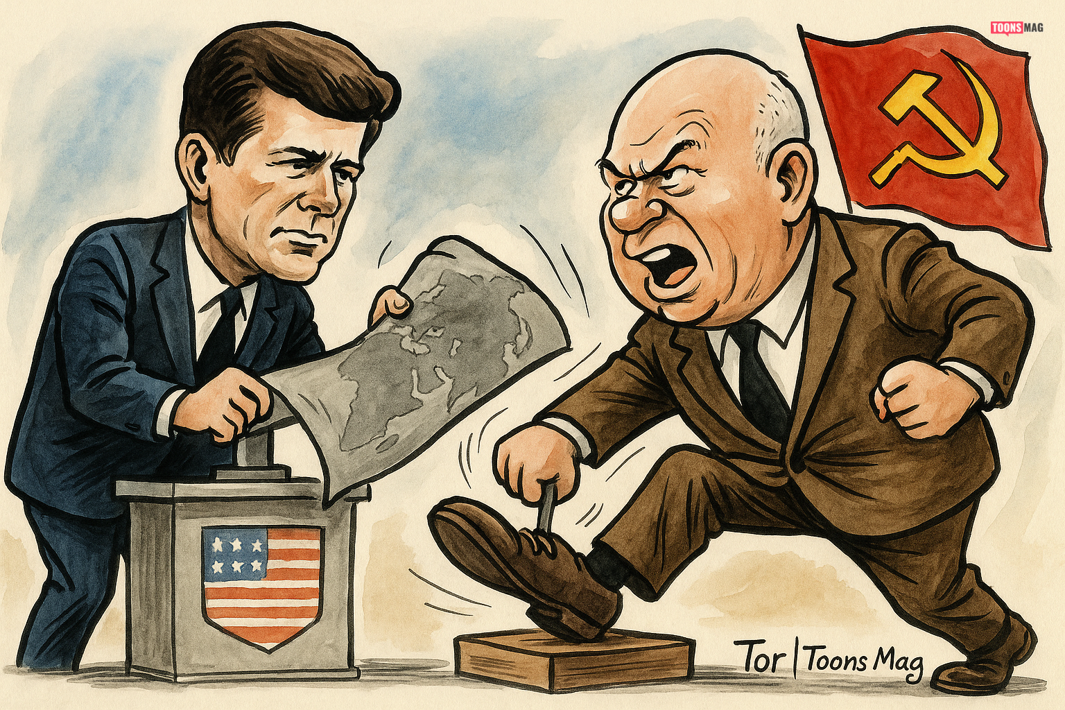 One iconic cartoon from the Cold War era is the famous depiction of Khrushchev pounding his shoe on the podium during a speech at the United Nations in 1960. While the event itself was serious, cartoons that followed turned it into a symbol of Soviet aggression and bluster, highlighting the tensions of the time. Cartoons like these played a significant role in shaping the public’s perception of the Cold War and the political maneuvering of both powers.