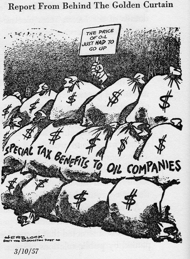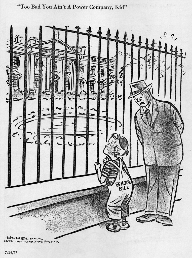 President Eisenhower held that position, and in Block’s cartoons, he is consistently depicted as a weak, ineffective politician, the unwitting partner of Richard Nixon. The cartoonist brought to light dishonest deals carried on by Nixon long before the Watergate scandal.