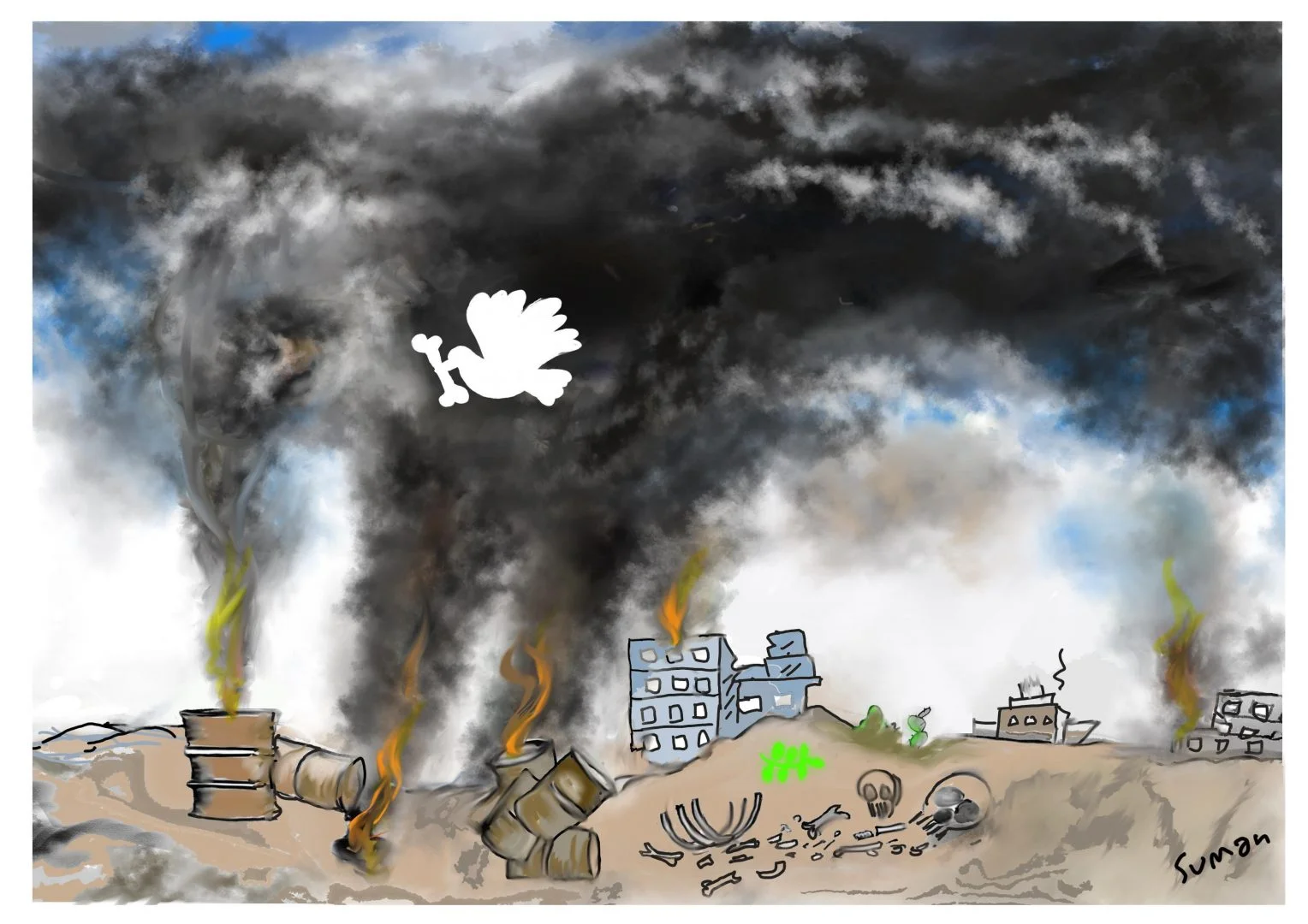 Even pigeon is forced to drop its olive leaf and pick born when American eagle is flying above. ( Dark smoke represents the eagle with its wings spread widely )