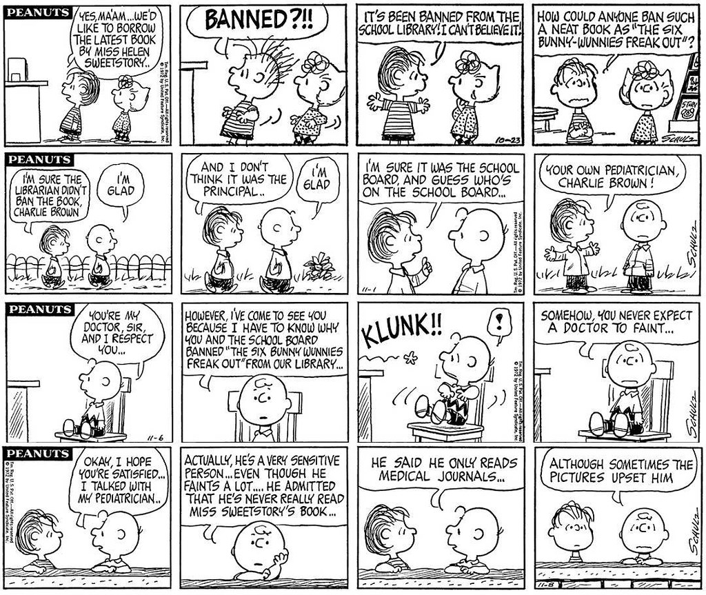 Another #tbt post for #bannedbooksweek. Excerpts from a series of Peanuts comic strips from the 1970s about censorship from the awesome Charles Schulz. Note: When Linus and Charlie Brown finally track down the person that challenged ‘The Six Bunny-Wunnies” by ALA – The American Library Association is licensed under CC BY-NC-SA 2.0