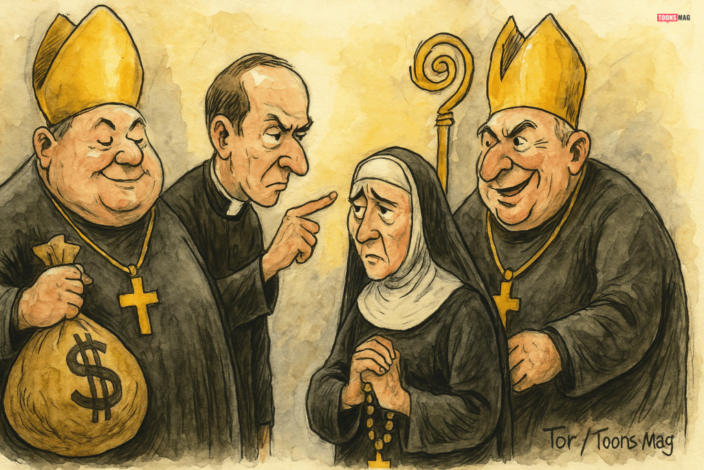 In the United States, 20th-century editorial cartoonists also satirized Christian institutions, albeit more carefully in a nation that remained deeply religious. Still, the Catholic Church’s scandals have not been immune. When widespread clerical sex abuse came to light in the 2000s, cartoonists depicted bishops sweeping crying children under a carpet, or pastors wearing stained garments, as stark visual indictments of cover-ups.